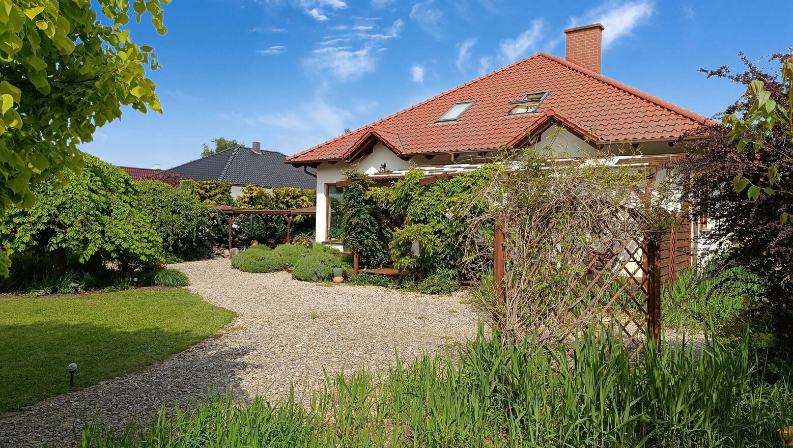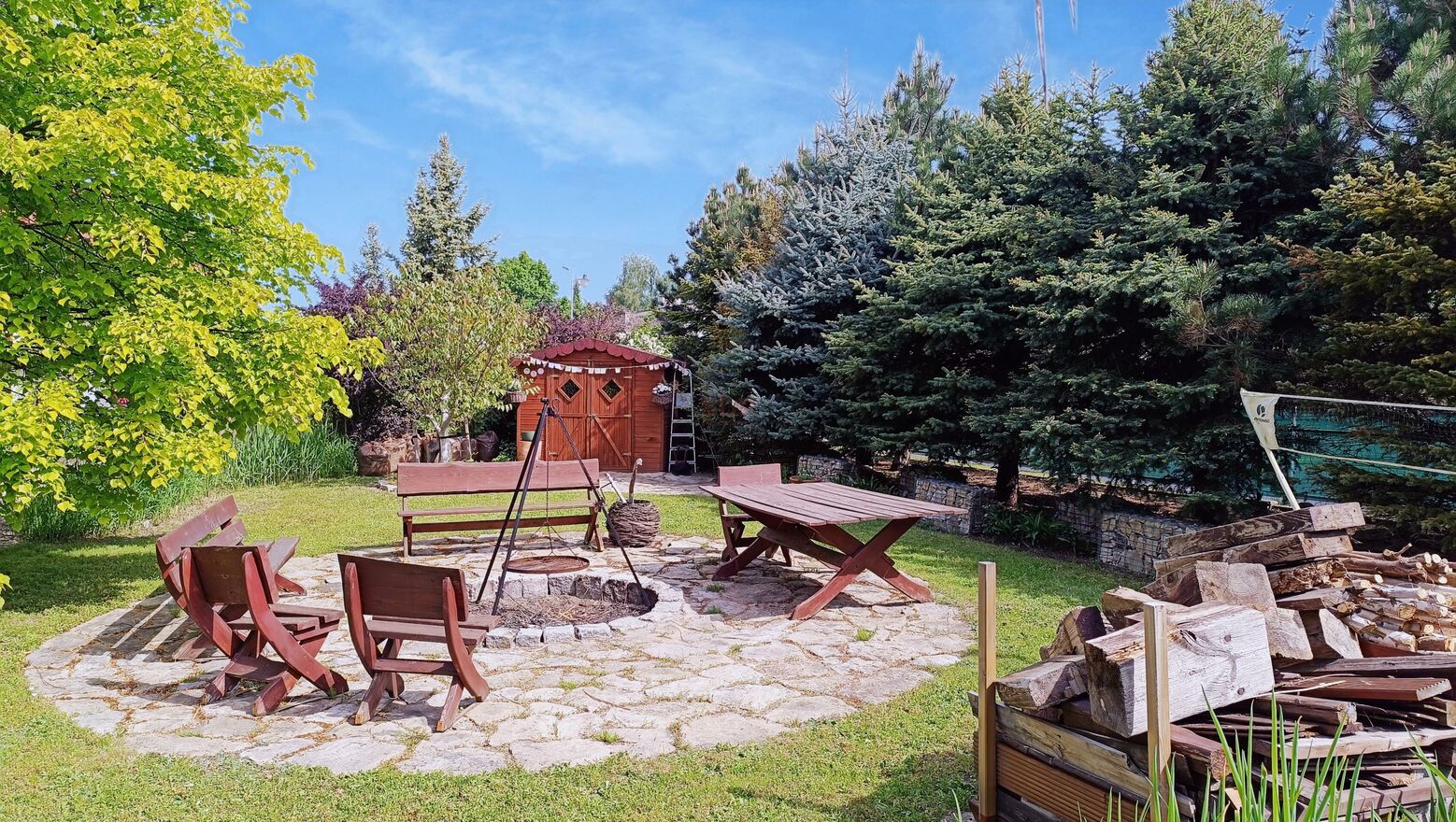 Od strony południowej i południowo-wschodniej wokół domu drewniane tarasy o pow. 65 m2. Z uwagi na wielkość działki wydzielono na niej obszary o różnorodnym przeznaczeniu, m.in: klasyczny ogródek, ognisko, altanę, drewutnię na drewno kominkowe. Przed budynkiem garaży jest wystarczająca przestrzeń na zaparkowanie 4 dodatkowych samochodów. Ponadto teren trawnika od strony ulicy poza obszarem ogrodzonej posesji również stanowi część własności, która także może być wykorzystywana jako miejsce do parkowania lub do obsadzenia roślinnością.