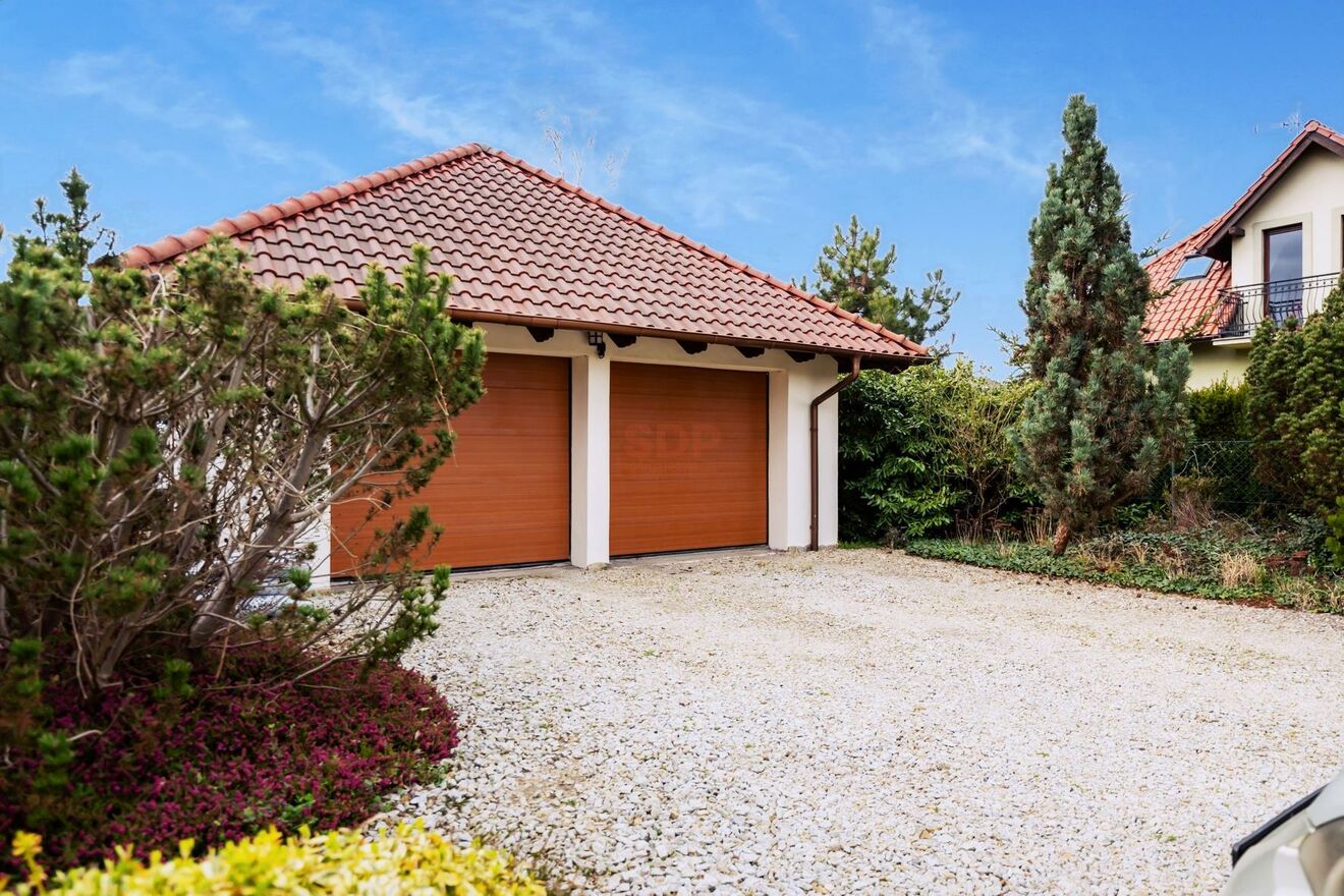 Wolnostojący budynek o powierzchni ok 60 m2 i gabarytach (szerokość, długość, wysokość) pomieści dwa bardzo duże pojazdy, w tym również busy, jednocześnie zapewniając miejsce na wiele innych rzeczy, których nie chcemy przechowywać w domu. Drzwi garażowe otwierane elektrycznie. Podobnie jak wjazd na teren posesji.